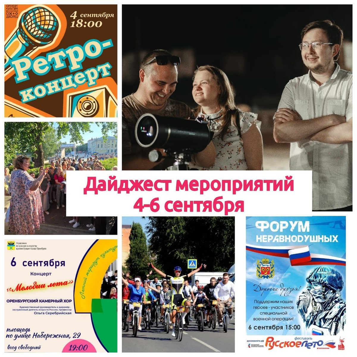 Культурная и спортивная афиша Оренбурга на 4-6 сентября Все мероприятия можно посетить бесплатно. 4 сентября (Среда) 18:00 — Ретро-концерт на площади перед ДК «Молодежный». 5 сентября (Четверг) 10:00 — Открытие фестиваля женского спорта «Оренбургская сударыня» в СКК «Оренбуржье» (продлится два дня). 6 сентября (Пятница) 10:00 — Городской футбольный турнир памяти Шатунова и Кузнецова на стадионе «Коммунальщик». 13:00 — Фестиваль «Бердская слобода» с концертом и мастер-классами в ДК «Орбита». 15:00 — Велофестиваль «Золотая осень» у стадиона «Оренбург». Нужна регистрация. 15:00 — «Форум неравнодушных» и фестиваль «Русское лето» на пл. Ленина: ярмарка, выставка техники, концерт. 18:00 — Мастер-класс по аппликации в Доме-музее Гагариных. 19:00 — Концерт муниципального камерного хора у Музея истории города. 19:00 — Бесплатная экскурсия по «гагаринским» местам Оренбурга. 19:00 — Лекция о телескопах в Гагаринском дворике, а в 20:00 — показ фильма «Космический рейс».