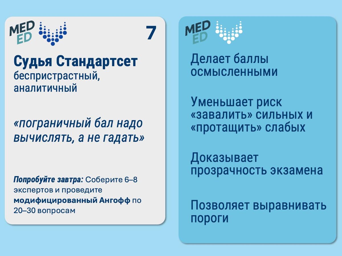 💡 СУДЬЯ СТАНДАРТСЕТ — ПОРОГ «СДАЛ/НЕ СДАЛ» Стандарт-сеттинг — это не «мистические 70%», а формализованная процедура, где эксперты задают минимальный приемлемый уровень компетентности и превращают его в пороговый балл. Есть разные методы для разных форматов: Ангофф — для тестов, Hofstee — когда нужен «коридор» допустимой строгости, Пограничные группы/регрессия — для ОСКЭ, Закладки— для больших банков тестовых заданий. 🔵 ЗАЧЕМ НАМ СУДЬЯ? Чтобы решение «сдал/не сдал» было защищаемым и честным: есть протокол, аргументы, подписи. И чтобы результат зависел от сложности экзамена и требований к минимально компетентному, а не от привычки «ставим проходной 70% всегда». 🔵 КАК ЭТО ВЫГЛЯДИТ НА ПРАКТИКЕ. 1. Собираем 6–10 экспертов и описываем образ минимально компетентного выпускника. 2. Для теста: эксперты оценивают по каждому тестовому заданию, какая доля таких студентов правильно ответит на каждое из заданий → усредняем → получаем пороговый балл (например, 72 %). 3. Для ОСКЭ: соединяем балл