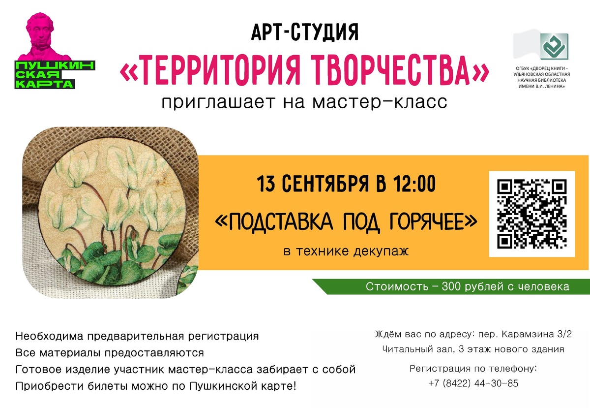 🧶Любите творчество и рукоделие? Хотите провести время интересно, с пользой? Вам нравится создавать что-то своими руками? Тогда этот мастер-класс именно для ВАС! 🎨 13 сентября в 12:00 АРТ-студия «Территория творчества» проведет мастер-класс «Подставка под горячее» в технике декупаж. Любой желающий сможет своими руками создать полезный аксессуар для дома! 😍 Все материалы предоставляются организаторами. Готовое изделие участники мастер-класса забирают с собой. ✴️ Стоимость участия — 300 рублей с человека. Купить билеты Приобрести билеты можно по Пушкинской карте! 🎫 ОБРАТИТЕ ВНИМАНИЕ! Необходима предварительная регистрация! Телефон для справок и регистрации: 8(8422)44-30-85 – Читальный зал Дворца книги.