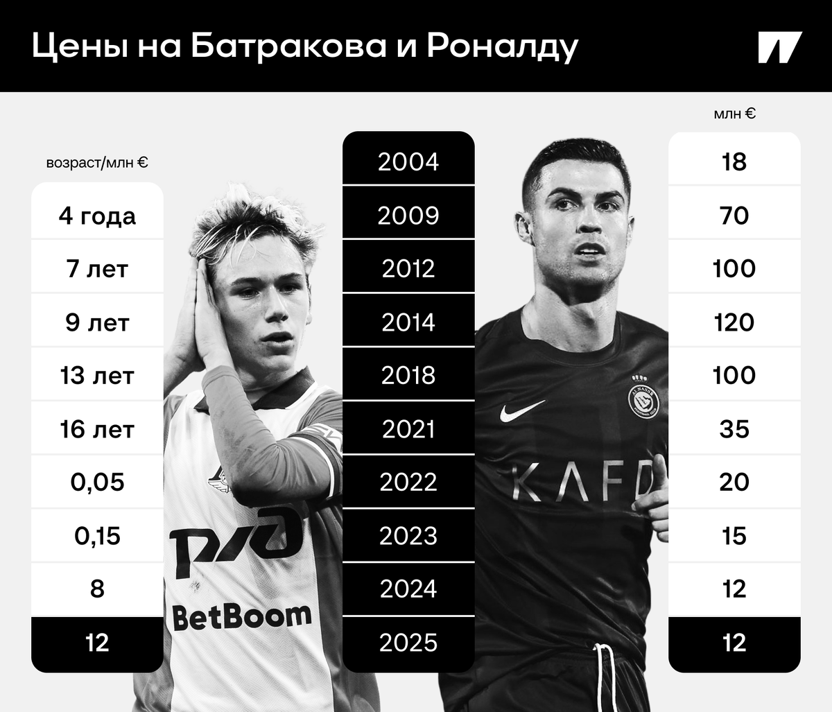Роналду уже стоил больше десяти миллионов, когда Батраков еще не родился, а больше сотни – когда россиянину не было и десяти лет. Да что уж там – в позапрошлом году Роналду был дороже нашего игрока ровно в 100 раз!