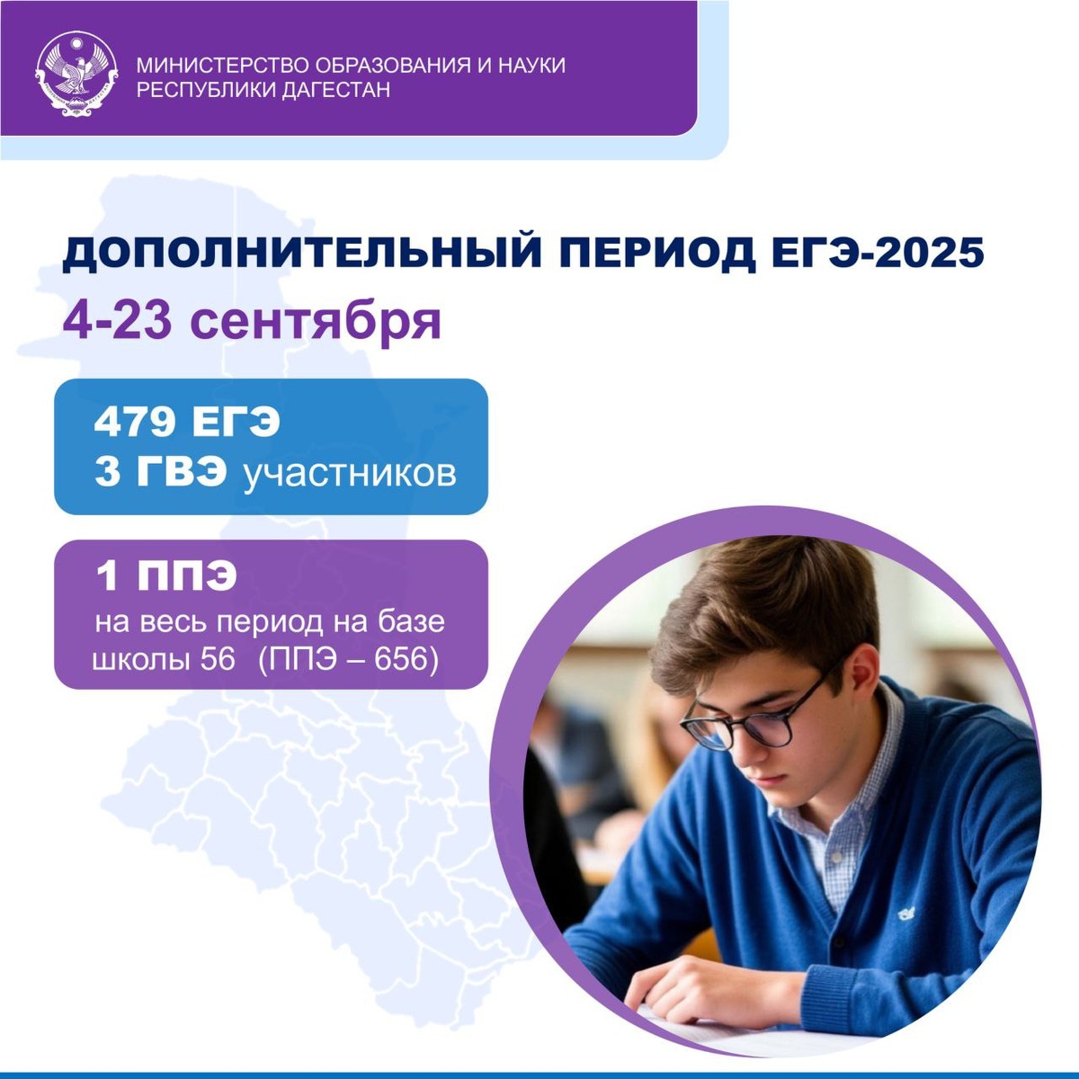 📏В Дагестане стартовал дополнительный период ЕГЭ для выпускников 11-х классов С 4 сентября начался дополнительный этап государственной итоговой аттестации для одиннадцатиклассников. В этот период экзамены могут сдавать те выпускники, которые не прошли ГИА в основной срок или не получили аттестат. ✏️Сегодня школьники республики пишут ЕГЭ по русскому языку. К участию допущены ребята, не прошедшие итоговую аттестацию по уважительным причинам и выпускники, не набравшие минимальный балл по русскому языку и математике. На экзамен зарегистрировано 250 участников: 🔘247 человек сдают ЕГЭ, 🔘3 участника – государственный выпускной экзамен. Для проведения экзамена задействован один пункт проведения — ППЭ-656. Экзаменационная работа по русскому языку включает: 🔘26 заданий с кратким ответом; 🔘1 сочинение с развёрнутым ответом. На выполнение даётся 3 часа 30 минут (210 минут). Результаты экзамена будут известны не позднее 15 сентября. 🚩 Минобрнауки РД
