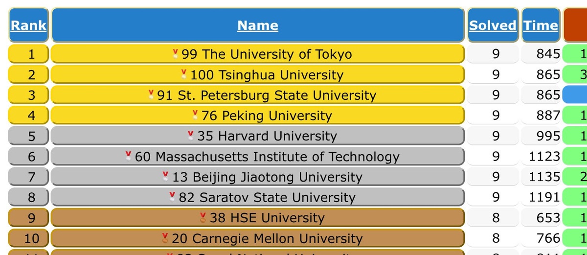 Участие казанских (и околоказанских) вузов в ICPC 2025 ICPC - крупнейшая международная студенческая командная олимпиада по программированию. Очень престижное мероприятие. Местные СМИ игнорируют событие, а мы посмотрим, как там наши в этом году. На текущий момент известны предварительные результаты. Окончательные опубликуют вечером, но из практики сильно от предварительных они отличаться не будут, поэтому примерно изучить результаты можно уже сейчас. Из наших вузов участвует лишь Innopolis University. У них предварительное 104-е место. В мировом масштабе очень достойный результат. КФУ и др. казанские вузы не смогли пройти в финал и в этом году, что печально. Какие российские вузы обходят Innopolis University? Как видно на первом скриншоте, в десятку вошли Petersburg State University, Saratov State University (внезапно!), ВШЭ (ожидаемо). В первой сотне ещё МГУ, Moscow Aviation Institute, ИТМО, МФТИ, Petrozavodsk State University. Участникам из Иннополиса наши поздравления. А КФУ