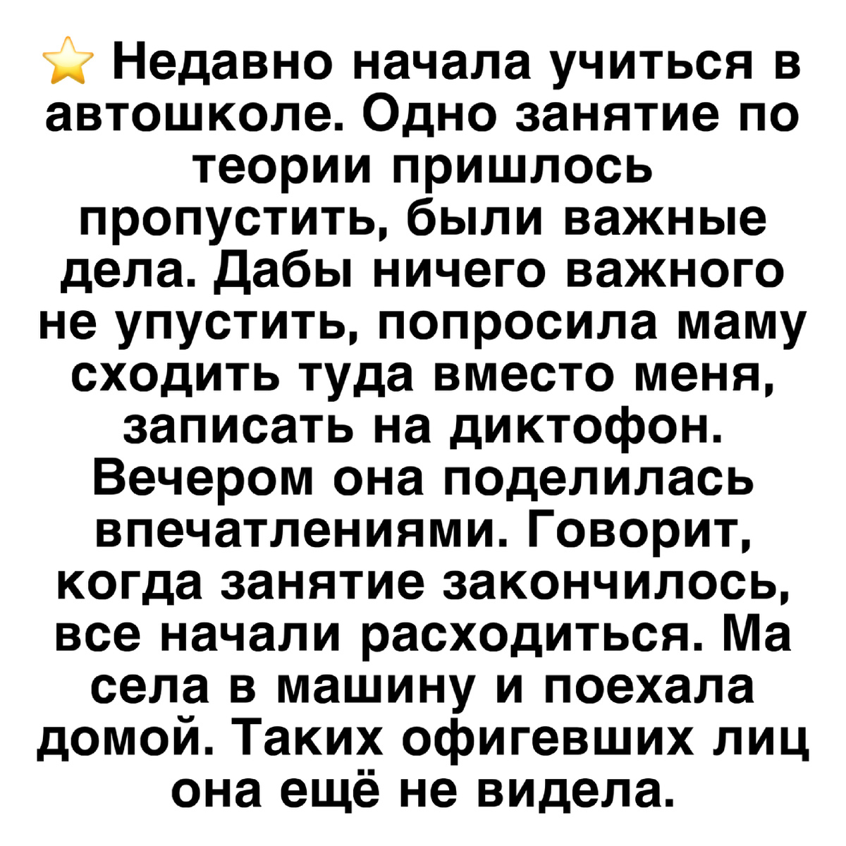 ⭐ Недавно начала учиться в автошколе. Одно занятие по теории пришлось пропустить, были важные дела. Дабы ничего важного не упустить, попросила маму сходить туда вместо меня, записать на диктофон. Вечером она поделилась впечатлениями. Говорит, когда занятие закончилось, все начали расходиться. Ма села в машину и поехала домой. Таких офигевших лиц она ещё не видела.