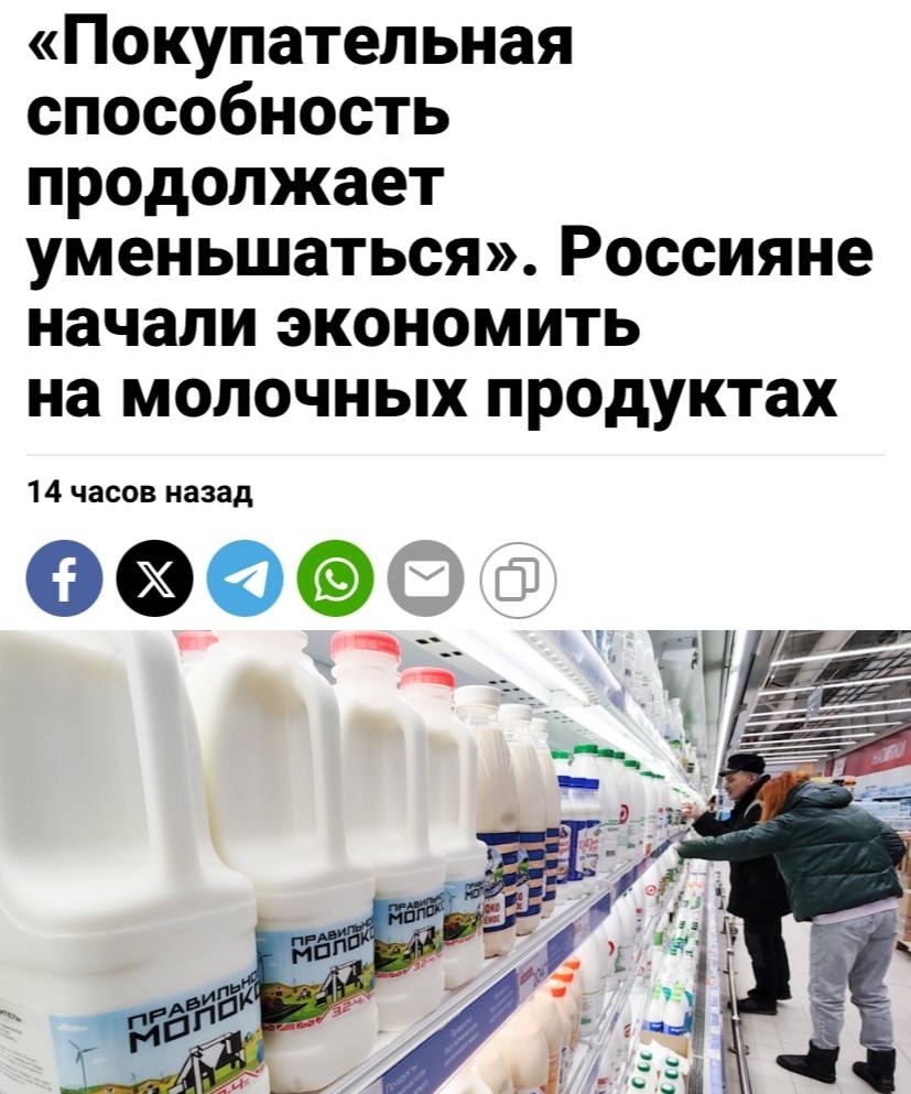 🥛 Россияне начали экономить на молочке — цены выросли на четверть за год. Особенно досталось сливочному маслу: подорожало почти на 40%. Даже скидки не помогают — люди все равно покупают меньше. Причины понятные: корма дорожают, электричество тоже, упаковка, доставка — все влетает в копеечку производителям. Глава Молочного союза прямо говорит: спрос падает каждый месяц на 1-2%. И это плохой сигнал.