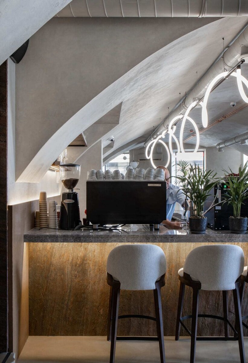 Интерьер, где фактура камня становится главным героем Петербургский ресторан «Гимназистка» расположен в цоколе пятизвёздочной гостиницы. Интерьер – тёплый минимализм, где песочные, сливочные и древесные оттенки идут в паре с мягким светом, живыми растениями и натуральными материалами. Часть стен и фасад острова кухни облицованы каменным шпоном в цвете Burning forest: • Горизонтальные полосы задают ритм; • Сланцевые переливы мягко работают с рассеянным светом днем и украшают зал приглушенными отблесками вечером; • На фоне светлых оттенков помещения (своды потолка, нейтральные ткани, дерево) камень благородно гармонирует через фактуру, а не цвет. Посмотреть все цвета каменного шпона можно здесь Или звоните нашим менеджерам – они помогут с просчётом проекта и предложат самые выгодные условия: 🤙+7 (495) 542-43-10