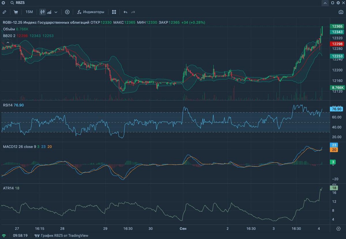 Как обещал, TA фьючерса $RBZ5 на индекс гособлигаций RGBI 📈 Тренд по дневному графику остаётся восходящим. На 15м/1ч/4ч — локальная перекупленность, чаще всего идёт короткий откат/флажок и затем продолжение роста. 🔹Уровни Сопротивления • 12380–12400 • 12440–12460 • 12520–12540 (верхняя полоса Боллинджера на дневке ~12529) Поддержки • 12335–12310 — зона возвратного теста (верхняя полоса на 4ч ~12313 + экспоненциальная средняя 15–60м). • 12270–12240 — базовый кластер часа (средняя линия полос Боллинджера на 1ч ~12231). • 12190–12110 — база 4ч и нижняя полоса Боллинджера дневки ~12105. 🔸Наиболее вероятный ход событий с точки зрения ТА: 1. Импульс → откат к 12335–12310, формирование небольшого флага на 15–60м. 2. Удержание 12335–12310/12270–12240 → возобновление роста к 12380–12400, далее к 12440–12460. 3. Отмена краткосрочного роста — часовое закрытие ниже 12240 → тогда высок шанс движения к 12190–12110 и поиск лонга уже там. ❓Где покупать/докупать (обычно беру лестницей, что бы