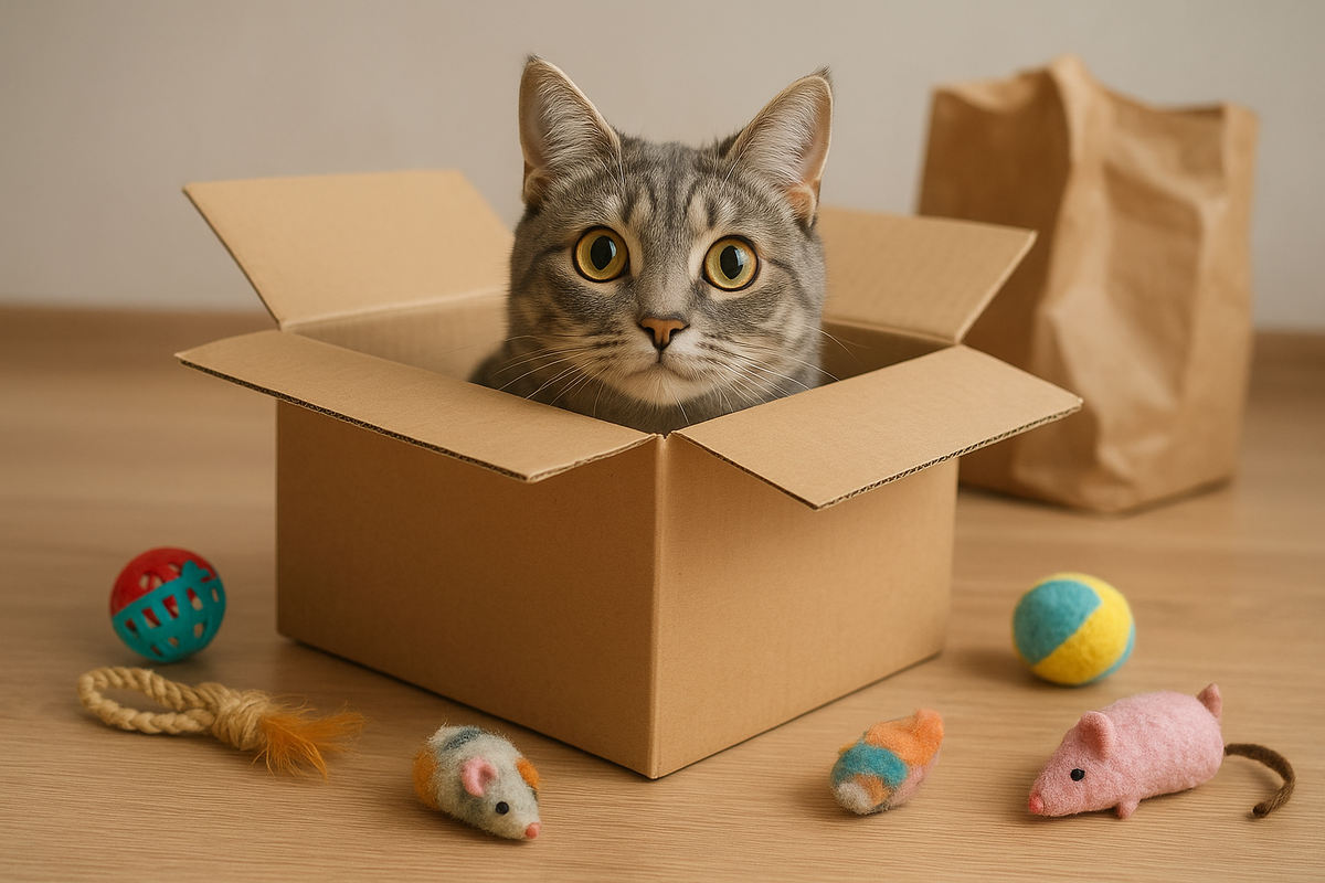 Автор статьи: ветеринарный врач — София 💞 Каждый хозяин хотя бы раз сталкивался с этим феноменом: вы приносите домой новую игрушку для кошки, распаковываете её, а питомец с восторгом забирается… не в игрушку, а в саму коробку или пакет. Кажется, что это просто забавная привычка, но на самом деле за ней стоят интересные особенности психологии и физиологии кошек. 😺 Инстинкт охотника Кошки по своей природе — хищники и одиночки. В дикой природе они всегда ищут укромное место, откуда можно наблюдать за добычей, оставаясь незамеченными. Коробка для домашнего кота выполняет ту же роль: она становится «засадой», где можно спрятаться и внезапно «атаковать» игрушку или хозяина. 🐾 Чувство безопасности и контроль территории Замкнутое пространство даёт кошке ощущение защищённости. Когда питомец сидит в коробке или пакете, он видит всё вокруг, но при этом остаётся в «убежище». Это снижает уровень тревожности, особенно у пугливых или недавно переехавших животных. 🌡 Тепло и уют Картон и ткан