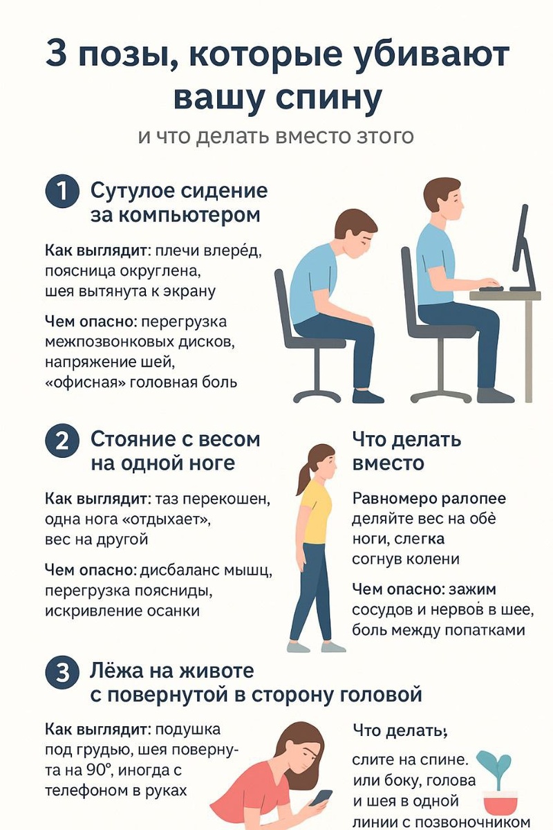 Почему неправильное положение убивает спину? Вы удивитесь, но позвоночник не любит «немного неудобно». Даже если кажется, что вы «всего часик посидите» или «постоите криво пару минут» — это запускает цепочку проблем. 🔻 Что происходит: Мышцы работают неравномерно — одни перенапрягаются, другие «ленятся». Диски и суставы получают нагрузку не туда, куда нужно. Возникает хроническое напряжение → микровоспаление → боль. Постепенно формируется деформация осанки и риск грыжи. 🛑 Самые частые ошибки: -сутулитесь за компьютером. -держите телефон на уровне живота, а не глаз. -спите в позе «калачиком» или на слишком высокой подушке. ✅ Что делать вместо: Следить, чтобы уши, плечи и таз были «в одной линии». Использовать опору для поясницы (маленькая подушка или валик). Каждые 40–60 минут — менять позу и вставать на 1–2 минуты. Как снять напряжение в спине во время работы смотрим ТУТ Для сна — ортопедическая подушка и ровная поза на боку или спине. Включите в свое утро выполнение