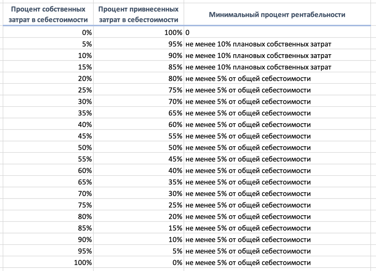 К счастью, в цитате выше помимо «не более» есть еще и «не менее». Чтобы понять, как правильно применить минимальный размер рентабельности мы должны взять нашу себестоимость и посчитать процент собственных затрат в ней. Для наглядности собрала все вам в таблицу.