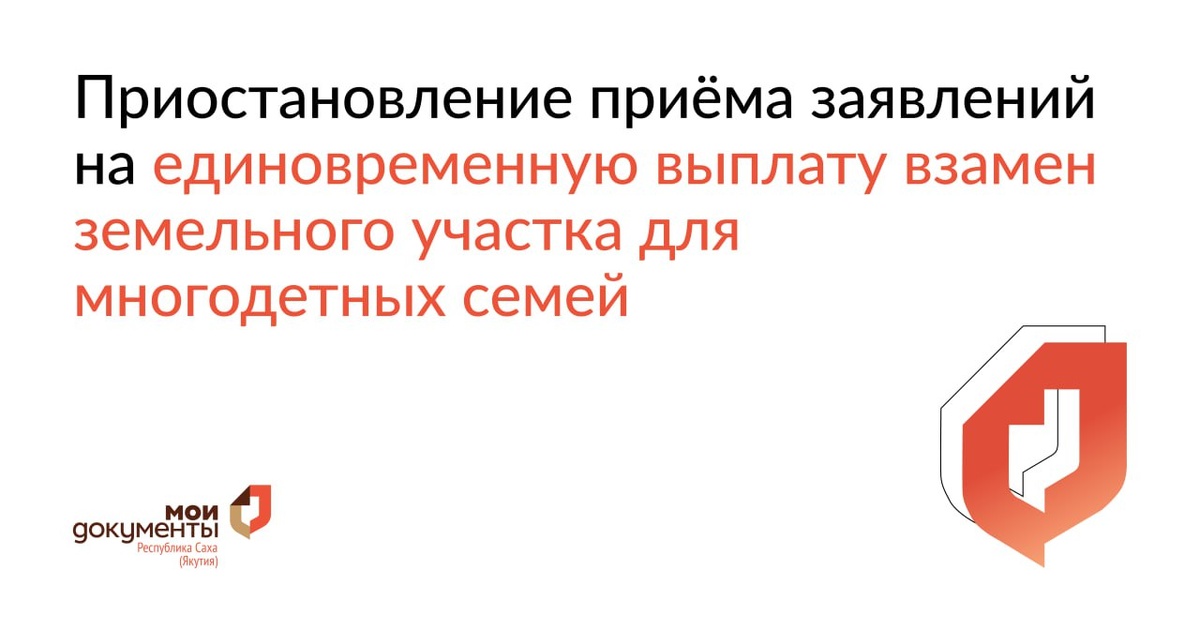 С 4 сентября 2025 года во всех офисах центра "Мои Документы" приостанавливается прием по услуге «Предоставление гражданам, имеющим трех и более детей единовременной денежной выплаты, взамен предоставления им земельного участка в собственность бесплатно»🔔 💡Ведомство: Министерство труда и социального развития РС(Я). Подать заявление можно будет с 2026 года в объеме выделенных бюджетных ассигнований. ✔️О возобновлении приёма будет сообщено отдельно на официальных страницах в социальных сетях центра "Мои Документы" и на портале mfcsakha.ru
