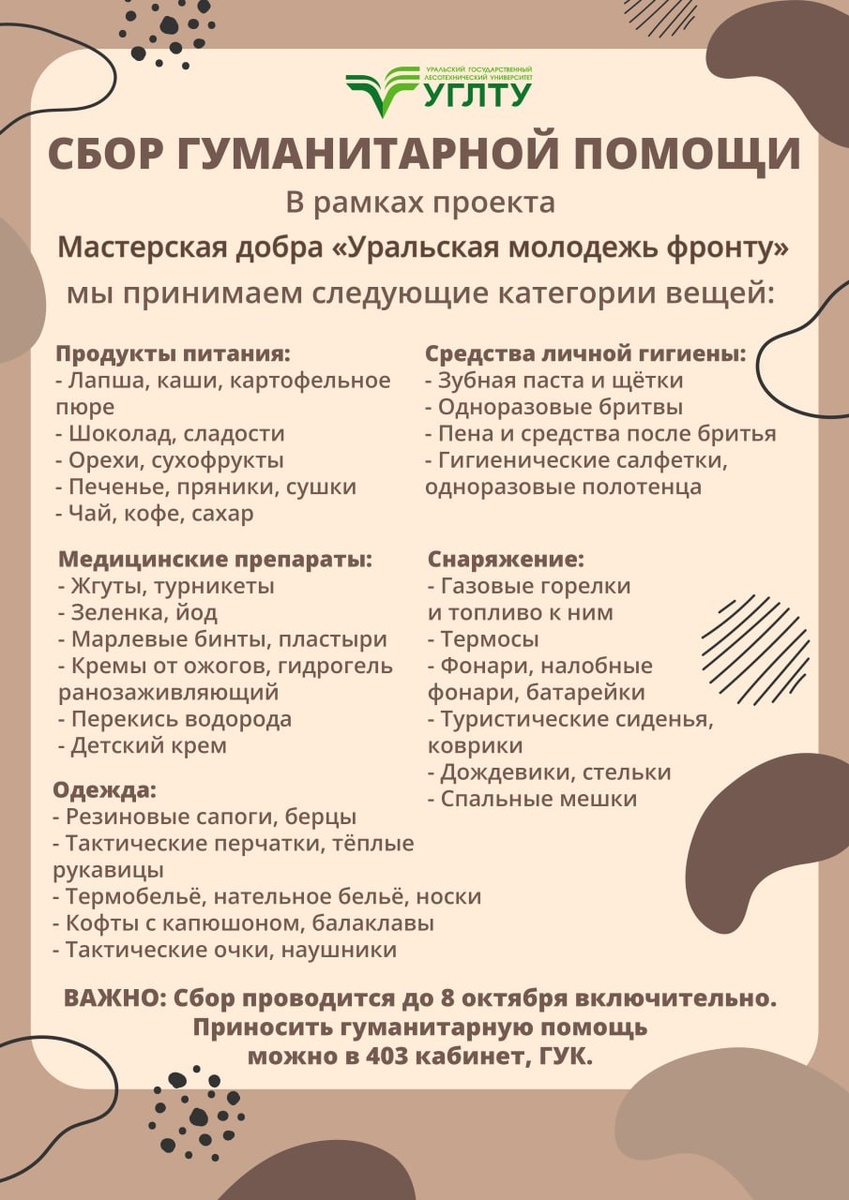 Мы вновь объявляем сбор гуманитарной помощи для участников специализированной военной операции. Сбор проходит до 8 октября в 403 кабинете Главного корпуса. Наши студенты-участники СВО поедут "за ленточку" и передадут собранную гуманитарную помощь непосредственно подразделениям. Вместе Победим! #вузы_фронту