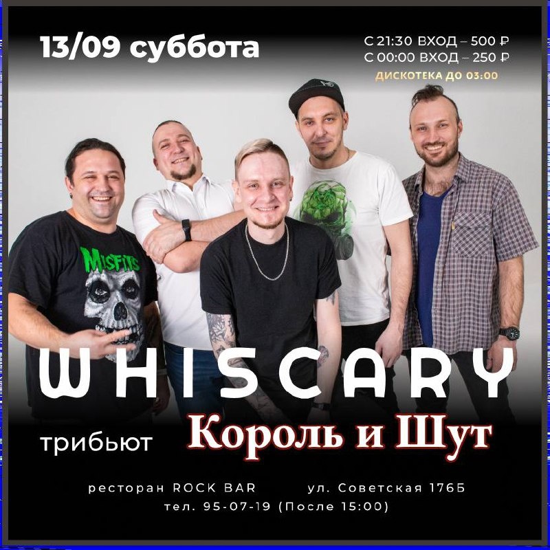 АНОНС 💥 13 СЕНТЯБРЯ ТРИБЬЮТ ”КОРОЛЬ И ШУТ” ГРУППА WHISCARY Большой концерт, много драйва, веселья и невероятная атмосфера под всеми любимые песни группы "Король и Шут"! After party дискотека. Входной билет 500₽, для гостей с 00:00 - 250₽ Встреча гостей с 19:00. Бронирование столиков проводится на время не позднее 21:30. ✅ Уважаемые гости! Пожалуйста, если Вы опаздываете, позвоните или напишите нам, при опоздании более 15 минут без предупреждения бронь снимается. АС 18+ FC/DC Данная публикация носит исключительно информационный характер. 📞INFO/RV (с 15:00) +7-9148-95-07-19 💻 INFO/RV: www.rockbar38.ru 📍г.Иркутск, ул. Советская 176Б