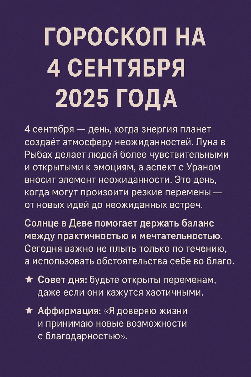 4 сентября — день, когда энергия планет создаёт атмосферу неожиданностей. Луна в Рыбах делает людей более чувствительными и открытыми к эмоциям, а аспект с Ураном вносит элемент неожиданности. Это день, когда могут произойти резкие перемены — от новых идей до неожиданных встреч. Солнце в Деве помогает держать баланс между практичностью и мечтательностью. Сегодня важно не плыть только по течению, а использовать обстоятельства себе во благо. ✨ Совет дня: будьте открыты переменам, даже если они кажутся хаотичными. ✨ Аффирмация: «Я доверяю жизни и принимаю новые возможности с благодарностью». Сегодня возможны неожиданные события в работе или личной жизни. Важно быстро адаптироваться к обстоятельствам. Финансовые вопросы могут выйти на первый план. Возможен неожиданный источник дохода или приятный бонус. День подарит новые знакомства и интересные диалоги. Ваша харизма поможет завязать полезные связи. Сегодня вас ждёт эмоциональный день. Возможны разговоры, которые давно откладывались