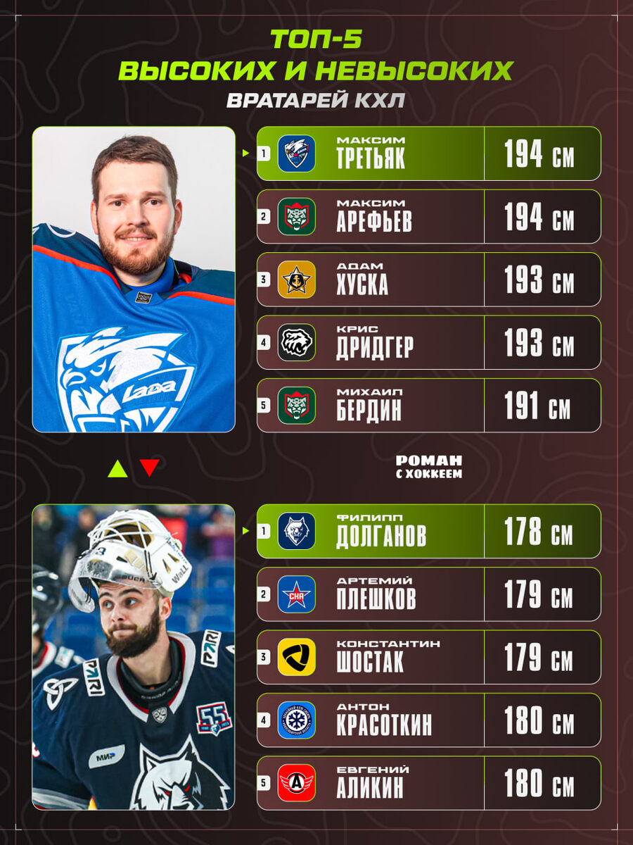 Здесь вы можете увидеть рост самых высоких и невысоких вратарей КХЛ по убыванию: