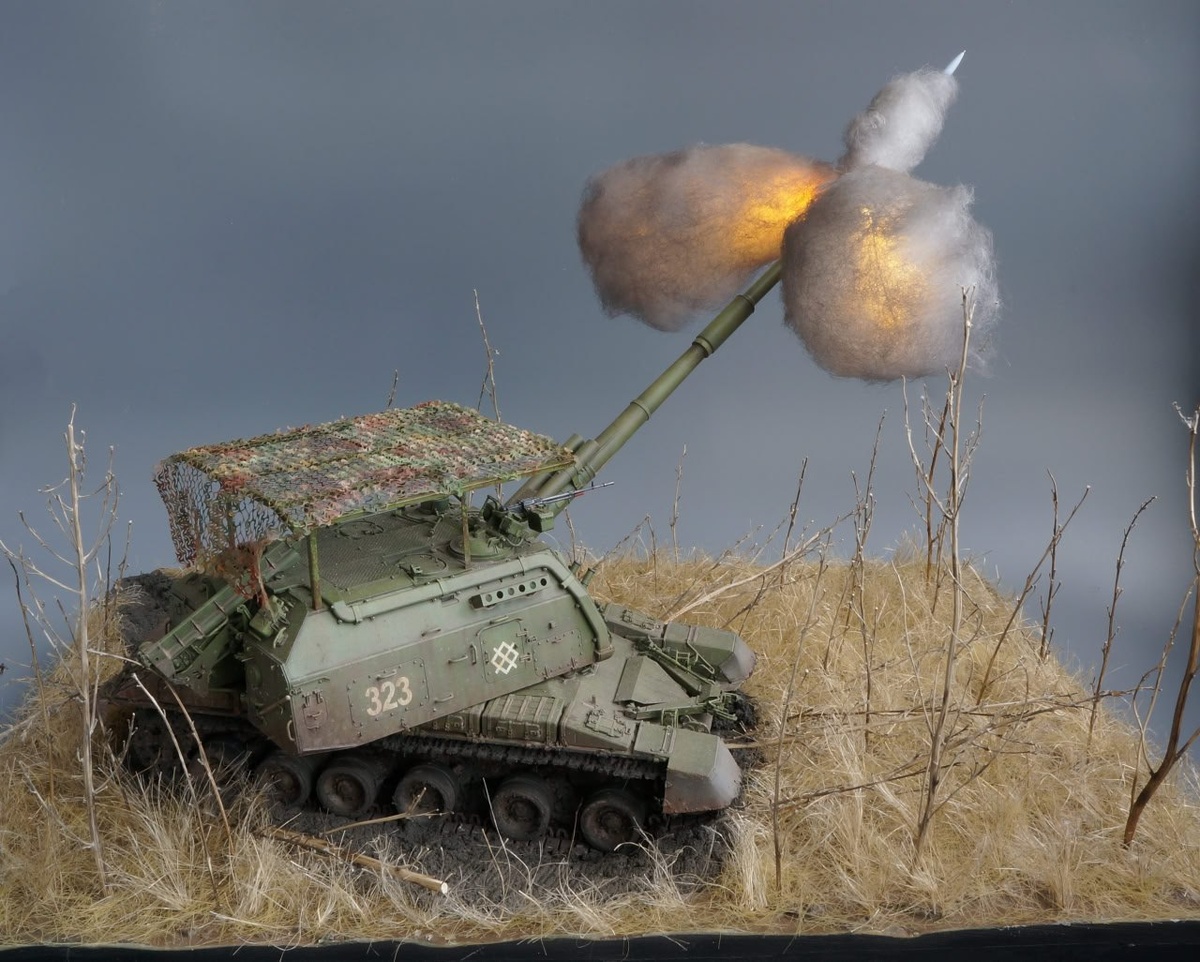 Диорама «За Волчанск» (На базе МСТА-С от Звезды 3630, 1/35) Автор: Тютюнин Евгений, Норильск, 2025 г. Этот проект, длившийся около года, создавался по просьбе моего друга Ивана для его брата - начальника артиллерии 1009-го мотострелкового полка. Идею о создании диорамы на тему СВО я вынашивал с начала конфликта, и за возможность её воплощения не только для себя, но и для боевого офицера, полковника, участника СВО, хочу выразить Ивану искреннюю благодарность. Было решено сделать диораму с САУ МСТА-С на огневой позиции. Скажу честно, никаких фото или видео с реальных боевых мест у меня не было, поэтому все что изображено чисто моя фантазия. Так как в основании диорамы необходимо было делать двойное дно для размещения элементов питания и кнопки, мастерил её из остатков ламината. Поверхность грунта, засеянного травой, делал из алебастра. Свежую разрытую землю делал так же из алебастра с добавлением земли и клея ПВА (для замедления схватывания алебастра). Поверхность грунта сначала засеял