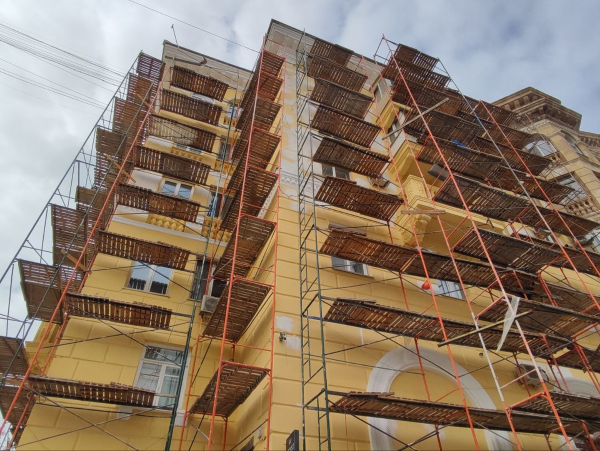 На главной улице Волгограда в активной фазе обновление двух исторических зданий. Ранее дома 1950-х годов постройки пугали горожан множеством заплаток и периодическими обвалами частей фасада.