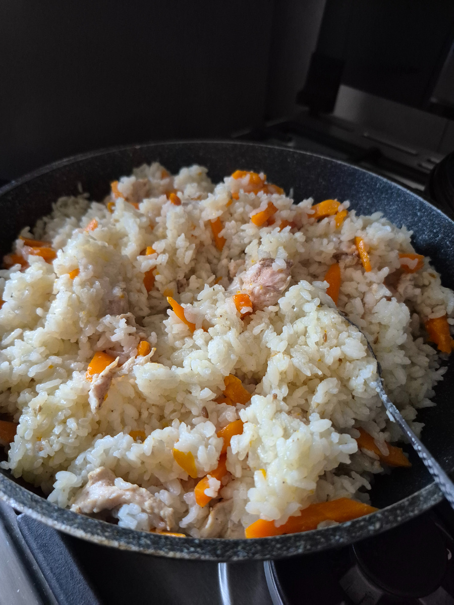 Промыть рис и залить тёплой водой,нарезать лук ,морковь, мясо любое,специи,соль,сухой чеснок или свежий,зирра,перец.Овощи и мясо обжарить,если мясо говядина,свинина,баранина надо добавить воды и потушить,потом рис. Воды налить кипятка на 1,5 пальца,накрыть крышкой на тихий огонь доготовности,перемешать, потом ставлю на час под подушку.Приятного аппетита!