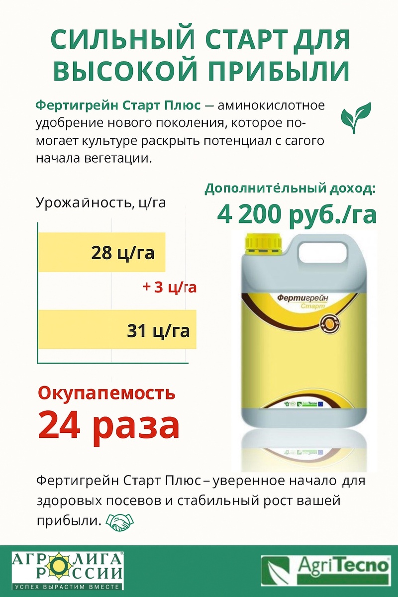 Фертигрейн Старт Плюс – аминокислотное удобрение нового поколения, которое помогает культуре раскрыть потенциал с самого начала вегетации. ♻️🌱 В опытах на озимой пшенице сорта Таня (Ставропольский край) его применение дало прибавку урожайности +3 ц/га, что принесло 4 200 руб./га дополнительного дохода. При минимальных вложениях всего 175 руб./га прибыльность очевидна — каждая вложенная единица средств возвращается в 24-кратном размере. 🎯 Фертигрейн Старт Плюс – уверенное начало для здоровых посевов и стабильный рост вашей прибыли. 🤝🏻 📞 Для получения большей информации обращайтесь в наши филиалы, представленные на сайте www.agroliga.ru 👈🏻
