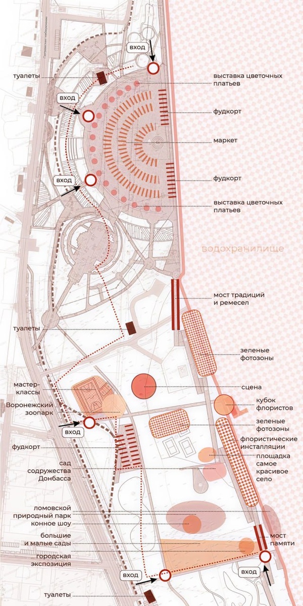 Итак, на Петровской набережной ближе к Чернавскому мосту будут представлены городская экспозиция, большие и малые сады, сад содружества «Донбасс», экспозиция Ломовского природного парка. Также в этой части разместятся Мост памяти и Мост традиций и ремесел, площадка «Самое красивое село», флористические инсталляции, зеленые фотозоны.