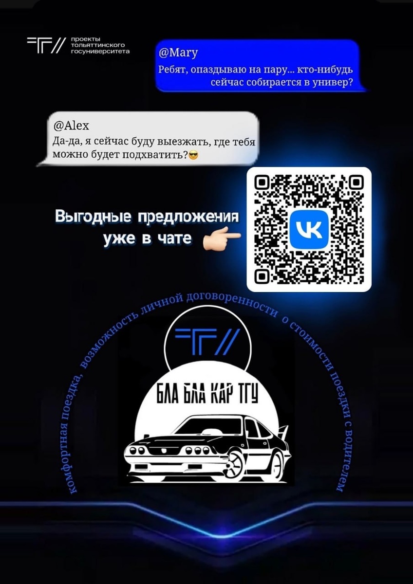 💭 Представь: ты просыпаешься на пары, за окном дождь и холод. И тогда ты выбираешь – поехать в переполненной маршрутке или в такси за космическую цену. Знакомо? Тогда следующая новость для тебя! В ТГУ есть добровольческая общественная организация «Бла Бла Кар ТГУ». Проект работает по принципу известного международного сервиса, нацеленного на поиск попутчиков. С важной поправкой: водителями и пассажирами могут стать только те, кто учится или работает в Тольяттинском госуниверситете. 📎 Специфика такая: – желающие добавляются в чат; – водитель и пассажир договариваются по времени и месту отправки; – едут в пункт назначения. 📌 Выгода для пассажиров: – комфортная поездка; – личная договорённость с водителем; – торг уместен. 📌 Выгода для водителей: – возможность выставлять условия бартера для пассажиров; – новые полезные знакомства. Заинтересовало данное предложение? Тогда присоединяйся в чат по ссылке: clck.ru/3P2Tci👈