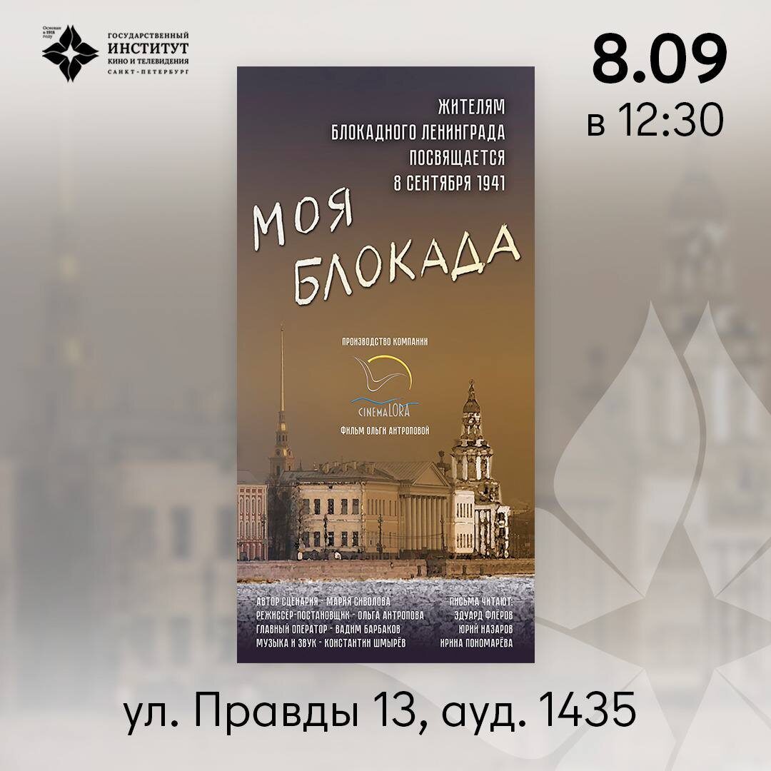 Показ фильма «Моя блокада» 🕯️8 сентября 1941 года началась блокада Ленинграда во время Великой Отечественной войны. В память о подвиге и невероятной стойкости жителей блокадного Ленинграда состоится показ документального фильма «Моя блокада». Над фильмом работали: Автор идеи — Мария Сиволова Режиссер-постановщик — Ольга Антропова Главный оператор — Вадим Барбаков Музыка и звук — Константин Шмырев 📅 8 сентября ⏰ 12:30 📍 ул. Правды, 13, ауд. 1435