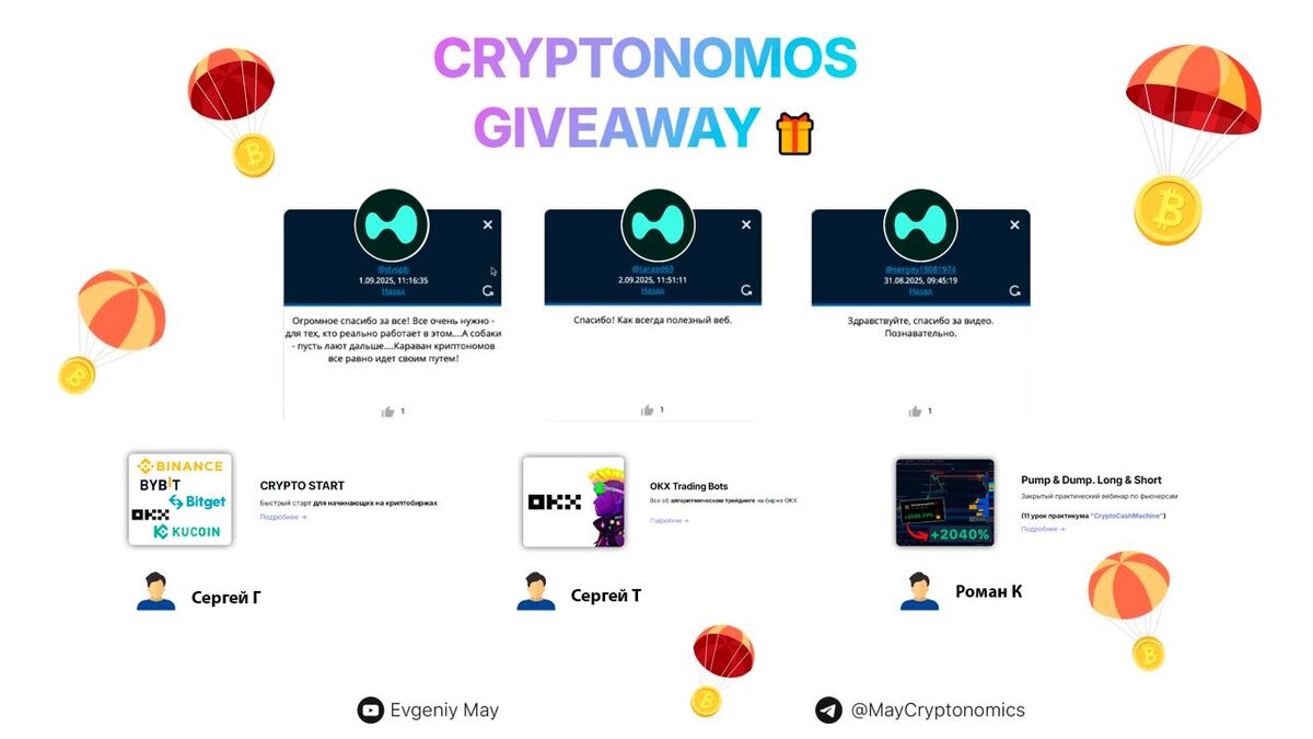 🥳 🏆 Поздравляем с победой в розыгрыше и благодарим за участие 🤗 💲По 0.722 HYPE выиграли: 1. Dvspb ✅ 2. Tarasd69 ✅ 3. Sergey19081974 ✅ 👋 Реквизиты для получения выигрыша пришлите Роману - @leonovdev 🔥 Курс/вебинар/урок выиграли: 1. Сергей Т (тел. **05) - Закрытый вебинар "OKX Trading Bots" - https://www.cryptonomos.pro/okxtradingbot ✅ 2. Роман К (тел. **00) - 11 урок «Pump&Dump. Long&Short» курса «CryptoCashMachine» - https://www.cryptonomos.pro/cryptocashmachine-lesson ✅ 3. Сергей Г (тел. **84) - Курс «CryptoStart» https://www.cryptonomos.pro/cryptostart ✅ Участвуйте и выигрывайте 🏆😎 #Cryptonomos #GiveAway