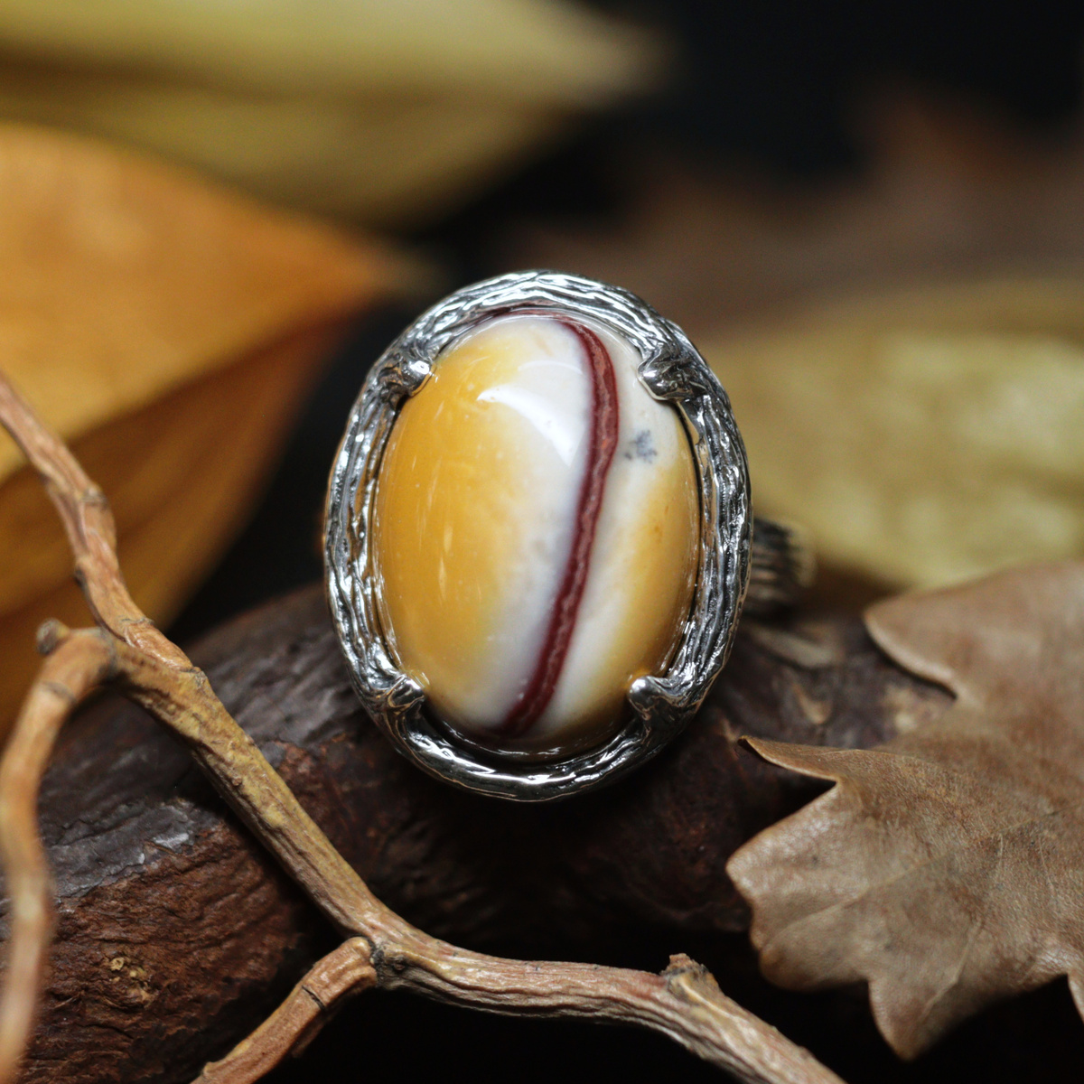 Кольцо сделано на заказ и уже отправилось к своей волшебной хозяйке. Этот чудесный камень с выразительным природным рисунком в оттенках теплой осени заказчица выбрала сама из наших запасов мукаита. Мукаит - разновидность радиолярита, его добывают в Австралии. Радиолярит представляет собой осадочную, обычно глубоководную горную породу, состоящую из окаменевших радиолярий - планктонных организмов, обитающих в морской воде. Название камня дано по месту находки - берегов реки Мука-Крик (Mooka Creek). Mooka с языка австралийских аборигенов переводится как бегущие или текущие воды. Австралийские аборигены считают мукаит камнем силы, который укрепляет тело и дух, улучшает здоровье и интеллектуальные способности. Мукаит развивает врожденные таланты, поддерживает на пути к цели, настраивает на позитив. Полезное свойство мукаита - он помогает бороться с прокрастинацией, не дает откладывать дела на потом, улучшает концентрацию и погружение в рабочий процесс. Кольцо сделано из серебра с чернением.