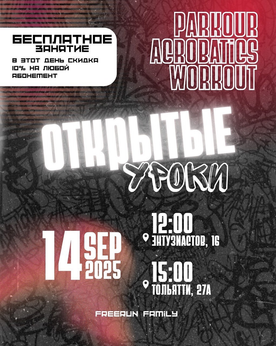 В Тольятти 14 сентября пройдут бесплатные открытые уроки по паркуру, воркауту и акробатике В Тольятти 14 сентября пройдут открытые уроки по паркуру, акробатике и воркауту для всех желающих. Мероприятие предоставляет возможность новичкам познакомиться с дисциплинами, попробовать свои силы и определиться с выбором направления. Паркур, как искусство эффективного преодоления препятствий, требует не только физической подготовки, но и развитого пространственного мышления, что особенно полезно для детей и подростков. Занятия пройдут на двух площадках: Энтузиастов, 16: – 12:00 — паркур и воркаут – 12:00 — акробатика для детей от 6 лет – 12:30 — акробатика с элементами стрип-пластики Тольятти, 27А: – 15:00 — паркур и воркаут – 16:00 — акробатика для детей от 6 лет Участие доступно исключительно для начинающих. Родители могут сопровождать детей на уроках. Для посещения обязательна предварительная запись. #паркур #новокузнецк #тольятти #уроки Подробнее...
