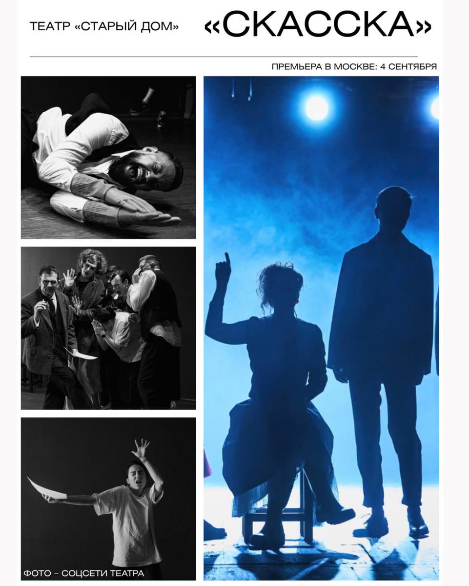 Новосибирский «Старый дом» расскажет абсурдистскую «Скасску» 🏠 С датой премьеры этого спектакля может возникнуть лёгкая путаница. На родной сцене его впервые сыграют 19 сентября, а вот жители и гости столицы увидят его уже сегодня, 4 сентября, если придут на фестиваль «Театральный бульвар» (конкретно — на Патриаршие пруды). Впрочем, сказать, что москвичи во всём опередят новосибирцев, было бы не вполне верно. Зрители «Старого дома» видели эскиз, из которого выросла эта постановка. Показали его в рамках «Режиссёрского марафона», проводившегося 10 ноября. Работа Арсения Мещерякова называлась «Случаи», как и знаменитый сборник Даниила Хармса (1939), на котором она основана. «Мы выбрали вариант масочного театра, где зерно характера персонажа проявится через какую-то крайнюю степень максимальной выраженности и яркости на сцене. Каждый персонаж — это некая маска, которая соответствует интенсивному музыкально-пластическому и хореографическому рисунку. Такой синтез хореографического, музык
