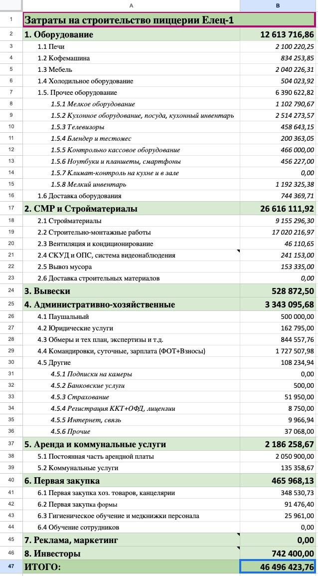 В ответ на пост 46,5 миллионов рублей – финальная смета строительства пиццерии в Ельце. Напомню: – Договор аренды подписан в сентябре 2023 года. – Доставка открыта в июне 2025 года, зал – в июле. – Общая площадь 389,3 кв.м. – Жилой дом. – Длительное проектирование, потом сложная стройка с попутным решением ошибок проектировщиков. В общем, простых строек у нас не бывает 🤷♂️ Ознакомиться с полной сметой и всеми расшифровками можно по ссылке.