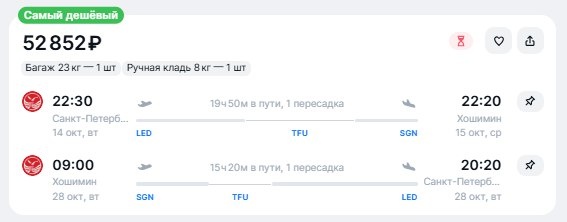 ✈️Санкт-Петербург - Хошимин (Вьетнам), туда и обратно с багажом, пересадка в Чэнду, за 52900 рублей 14 октября - 28 октября - https://checkintime.ru/ceqc 🏖 Поиск туров | ✈️Авиабилеты