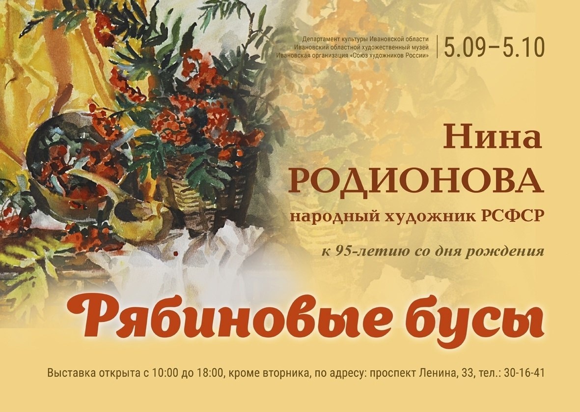 В художественном музее открывается выставка «Рябиновые бусы» 5 сентября в ивановском художественном музее откроется выставка «Рябиновые бусы», посвященная 95-летию со дня рождения народного художника РСФСР Нины Родионовой. В экспозиции представят акварели из собрания семьи художника и коллекции музея. Открытие пройдет в 16.00. Приглашаются все желающие. Посетить выставку можно будет до 5 октября. (0+) Фото: Ивановский областной художественный музей