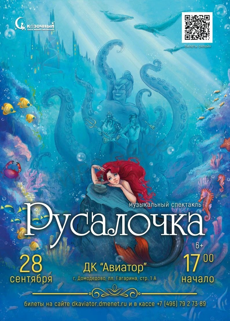 ✨ «РУСАЛОЧКА» Друзья! Приглашаем на музыкальный спектакль! ✨Однажды во время шторма младшая дочь морского царя случайно спасает тонущего человека, который оказывается принцем. Вернувшись в подводное царство, Русалочка постоянно думает о юноше: она влюбилась в него и мечтает ходить, бегать и танцевать на двух ногах, как принц. ❗Продолжительность спектакля : 1 час без антракта. Рекомендуем к просмотру зрителям от 4х лет. 🚫 Возраст: 6+ 📆 28.09.2025🕒17:00 🏢 Городской дом культуры «Авиатор» 📍 г. Домодедово, ул.Гагарина, д.1 🎫 Купить билет: https://iframeab-pre9671.intickets.ru/seance/63366971/ ✅ Мероприятия Домодедово https://dzen.ru/id/66f10385cc4c5a16f7b5fb02 http://vk.com/domodedovo_events http://dzen.ru/domodedovo_events