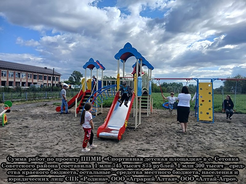 В селе Сетовка Советского района открыли спортивную детскую площадку Торжественное открытие спортивной детской площадки, которую обустроили благодаря участию в проекте поддержки местных инициатив, состоялось в Советском районе. Восемь спортивных тренажеров, комплекс для воркаута и детский игровой комплекс расположились на территории стадиона в начале футбольного поля.Тренажеры и комплекс для воркаута специалисты барнаульской компании по строительству спортивных и детских игровых площадок «Красный кит» установили в конце июня. Место под площадку предварительно подготовили жители села, собравшись на субботник: скосили траву и убрали мусор.Детский игровой комплекс, куда входят две навесные качели, качели-гнездо, две горки, стена для скалолазания, а также качели-балансир, карусель, песочницу, две лавочки, урну, информационный стенд и велопарковку монтировали уже в августе. Установкой занимались специалисты пр... Ссылка на публикацию #СоветскийРайон