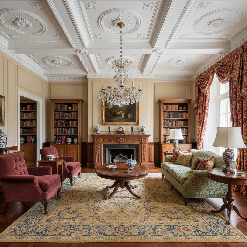 Создание торжественной гостиной требует особого внимания к каждой детали. Лепной потолок становится центральным элементом композиции, задавая тон всему помещению. Богатый растительный орнамент или геометрические формы создают впечатление роскоши и значимости.