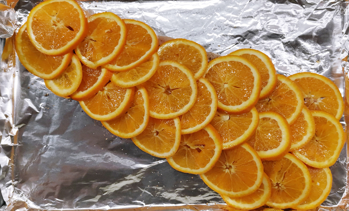 И покрываем весь кусок слоем апельсинов. Укладываем кружочки внахлест и так, чтобы рыба из под них не выглядывала. Рыбы у меня тут 600 г, апельсинов 3 штуки.