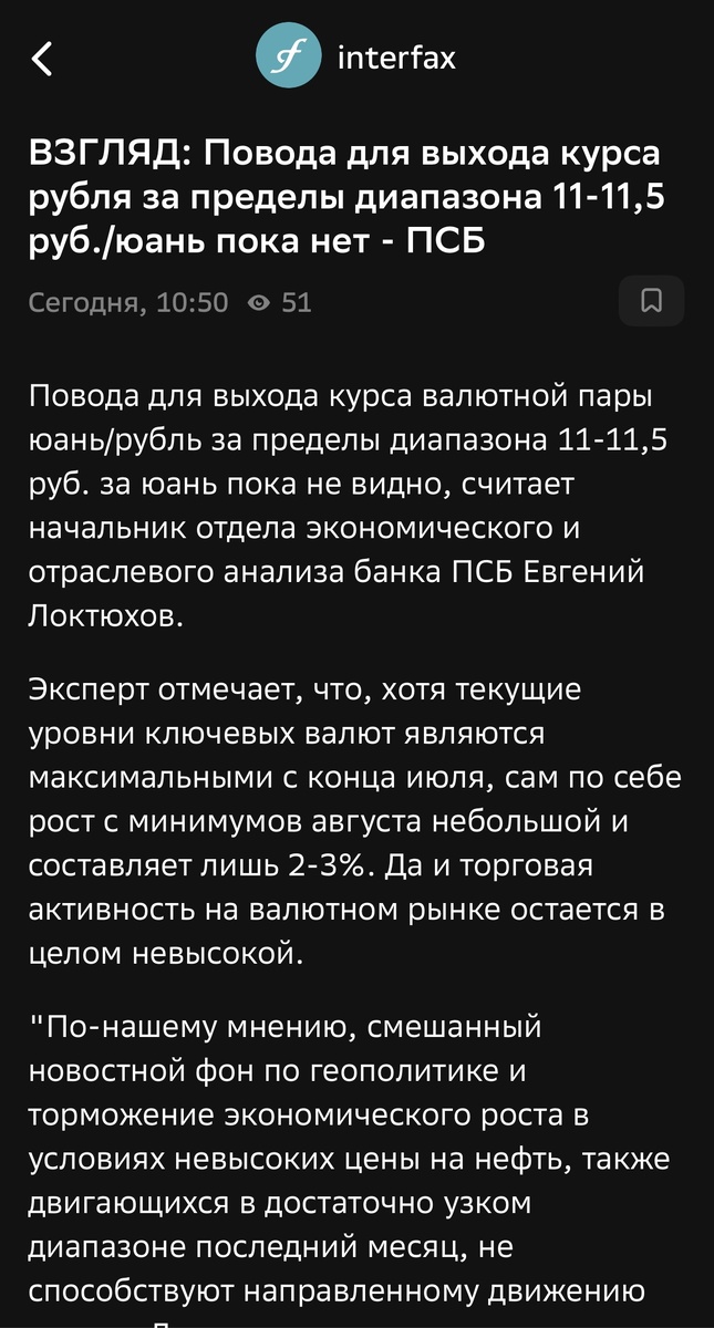 Утром Банк ПСБ устами своего аналитика Евгения Локтюкова заявил, что выходу рубля из диапазона 11-11.5 к юаню нет повода.