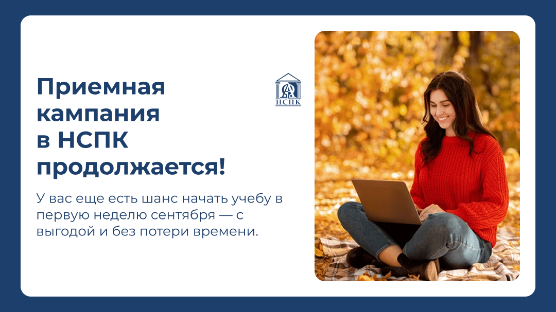 У вас еще есть шанс начать учебу в первую неделю сентября — с выгодой и без потери времени. С 1 по 5 сентября используйте промокод ДЕНЬЗНАНИЙ и получите дополнительную скидку -5% на первый семестр. Скидка суммируется с акциями на сайте! Почему стоит поступать именно сейчас? 🔹Цена фиксируется в договоре и не изменится даже при повышении в будущем. 🔹Учеба уже стартовала, но еще есть возможность нагнать программу до зимней сессии. 🔹Не придется откладывать мечту целый на год — вы получите диплом через 2–3 года в зависимости от специальности. НСПК — это: 🔹Новая академичность — классическое образование в современной форме. 🔹Система двух дипломов — больше перспектив и карьерных возможностей. 🔹Удобный формат — учитесь дистанционно, не отвлекаясь от личных дел. 🔹Простое поступление — без ЕГЭ и рейтинговых списков Набор-2025 продлен — запрыгивайте в последний вагон!🚂 Поступайте сегодня и начните движение к диплому вместе с НСПК!