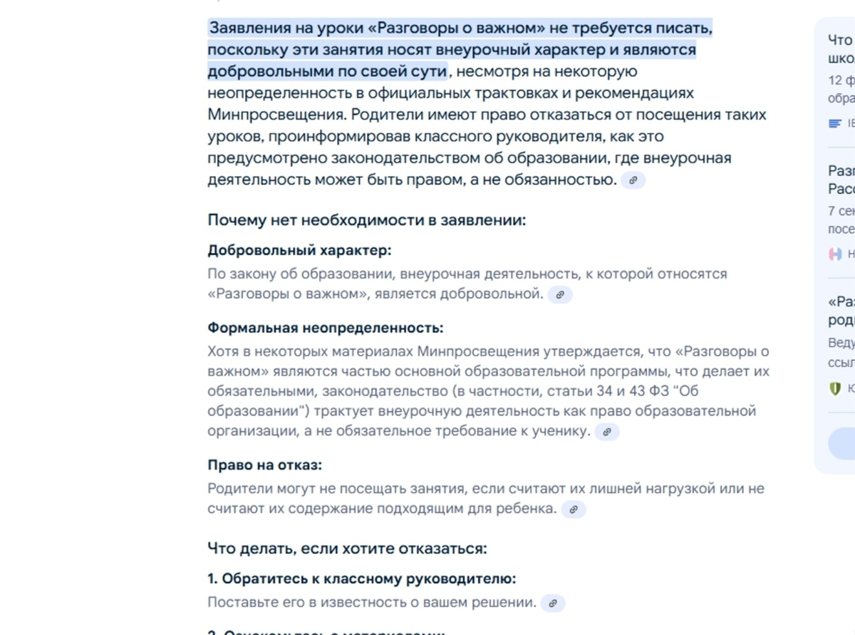 - Формальная неопределенность:Хотя в некоторых материалах Минпросвещения утверждается, что «Разговоры о важном» являются частью основной образовательной программы, что делает их обязательными, законодательство (в частности, статьи 34 и 43 ФЗ "Об образовании") трактует внеурочную деятельность как право образовательной организации, а не обязательное требование к ученику.