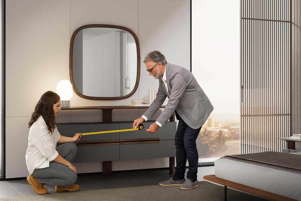 Главная ошибка — недооценка габаритов. Диван-«остров», ТВ-стенка и консоль должны работать вместе: оставляйте проходы 90–110 см, проверяйте высоты столешниц и расстояние до экрана. На «примерке мебели» мы ставим модели на место, чтобы вы сразу увидели пропорции в своём пространстве. Шаг 2 — Свет 2700К и «тёплые» сценарии