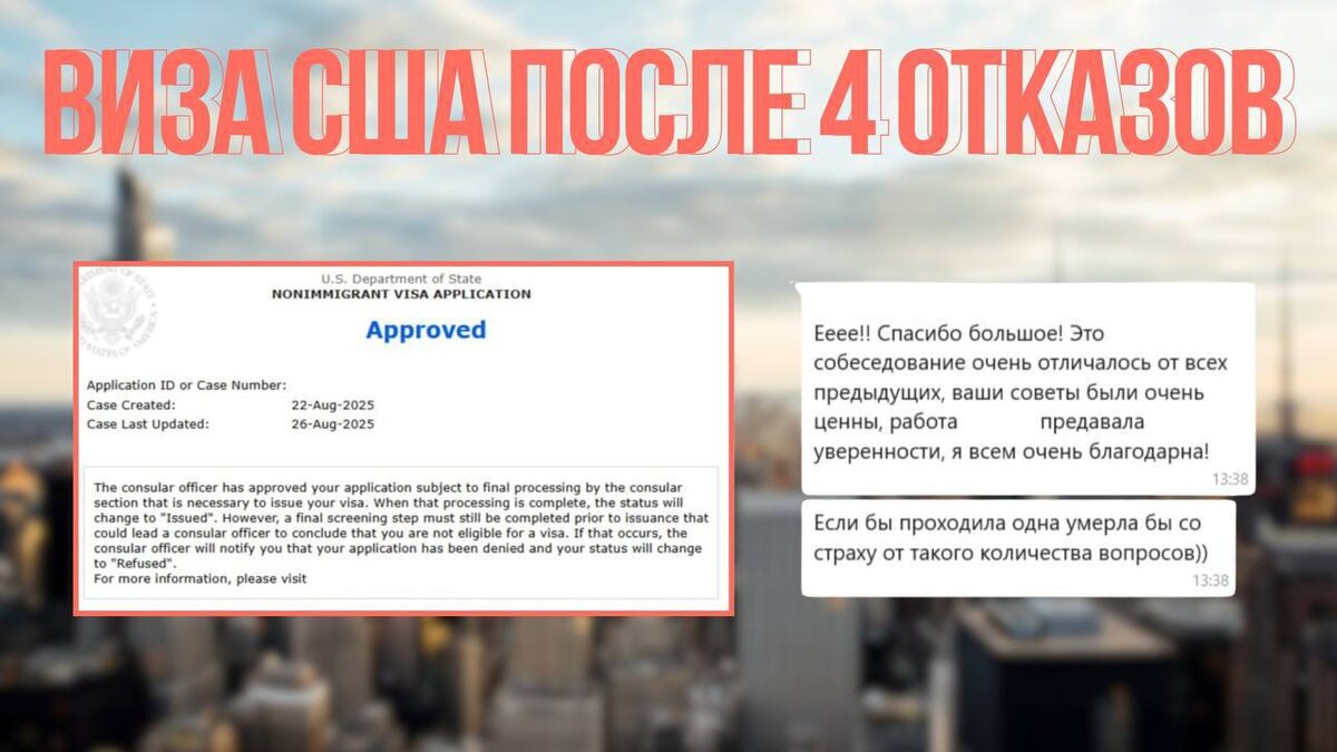 Виза США после 4 отказов 🇺🇸 26 августа: одобрение первичной туристической визы США гражданке РФ после 4 отказов. Кейс: девушка, состоит в браке и работает контент-менеджером. Планируется поездка с мужем, у которого уже есть виза США. В Америке проживают дальние родственники. Клиент получила 4 отказа в 2018, 2019, 2022, 2023 годах. За последние 5 лет было посещено 8 стран. Собеседование проходило с переводчиком. Вопросы консула: - Какая цель вашего визита? - Подавались ли ранее на этот тип визы? - Почему у вас были отказы? - Кем вы работаете? - Какая у вас зарплата? - Есть ли у вас имущество в собственности? - Кем работает ваш муж? - Хотела бы вы жить и работать в Америке? После ответов на вопросы консул одобрил долгожданную визу США! Получить визу США ⬅️ Записаться на консультацию ⬅️ #кейс #виза_сша #виза_после_отказа