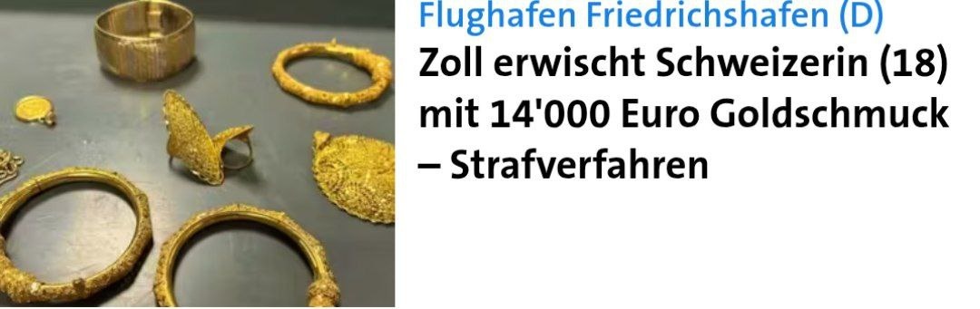 Π½Π΅Π΄Π΅Π»Ρ Π½Π°Π·Π°Π΄ ΠΎΠ±Π½Π°ΡΡΠΆΠΈΠ»ΠΈ Π½Π΅Π΄Π΅ΠΊΠ»Π°ΡΠΈΡΠΎΠ²Π°Π½Π½ΡΠ΅ Π·ΠΎΠ»ΠΎΡΡΠ΅ ΡΠΊΡΠ°ΡΠ΅Π½ΠΈΡ ΡΡΠΎΠΈΠΌΠΎΡΡΡΡ ΠΏΡΠΈΠΌΠ΅ΡΠ½ΠΎ 14 000 Π΅Π²ΡΠΎ (ΠΎΠΊΠΎΠ»ΠΎ 13 100 ΡΡΠ°Π½ΠΊΠΎΠ²). ΠΠ± ΡΡΠΎΠΌ Π² ΡΡΠ΅Π΄Ρ ΡΠΎΠΎΠ±ΡΠΈΠ» Π½Π΅ΠΌΠ΅ΡΠΊΠΈΠΉ ΡΠ°ΠΌΠΎΠΆΠ΅Π½Π½ΡΠΉ Π΄Π΅ΠΏΠ°ΡΡΠ°ΠΌΠ΅Π½Ρ. 18-Π»Π΅ΡΠ½ΡΡ ΡΠ²Π΅ΠΉΡΠ°ΡΠΊΠ° ΠΏΡΠΈΠ»Π΅ΡΠ΅Π»Π° ΠΈΠ· Π‘Π΅Π²Π΅ΡΠ½ΠΎΠΉ ΠΠ°ΠΊΠ΅Π΄ΠΎΠ½ΠΈΠΈ ΠΈ Ρ