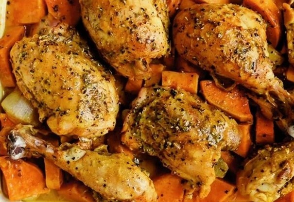 - Запекайте 35–40 минут, пока курица не приобретёт золотистую корочку, а батат не станет мягким. Один раз переверните батат в процессе, чтобы он равномерно пропёкся.