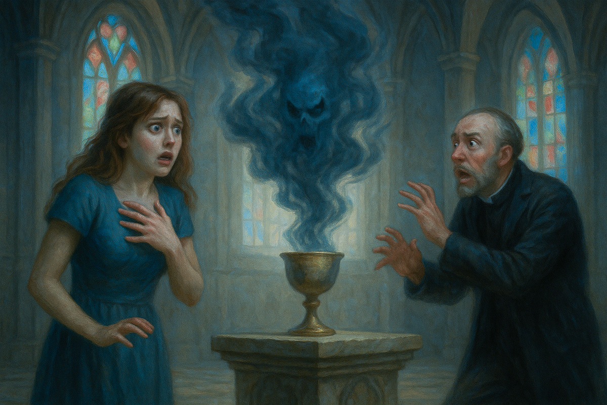 Александра не сразу поняла, где находится. Сначала ей показалось, что это сон, но воздух был слишком плотным, влажным, наполненным странным холодом, который чувствовался даже в лёгких. Вокруг стояли колонны, уходящие в темноту, и высокие своды скрывались в полумраке. Через огромные витражные окна пробивался тусклый свет, окрашивая каменный пол мягкими пятнами алого и синего. Всё было настолько реальным, что она ощущала запах пыли и древних свечей. Посреди храма стоял священник. Он был очень высокий, худой, с бледным лицом и глубокими тенями под глазами. Его голос звучал странно, глухо, словно откуда-то издалека. Он сказал, что Александра должна выпить святую воду, чтобы очистить душу. На каменном столе стоял кубок, и холодный пар стелился по его краям. Она протянула руку, но в тот момент взгляд священника изменился. Он словно стал другим, настороженным, напряжённым. Едва слышно он прошептал: — Прежде произнеси молитву. Александра удивилась, но кивнула. Ей показалось, что она знает слов