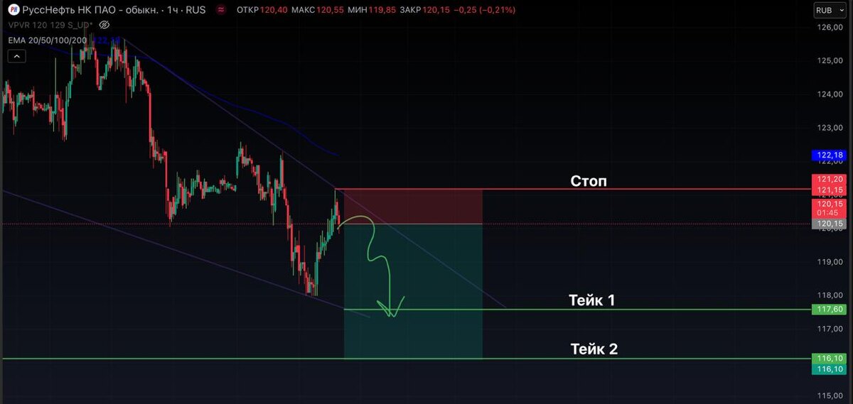 ❗️Нашел для вас позицию❗️ 📉 $RNFT ⛽️ шорт ➡️ Вход: по рынку ⛔️ Стоп: 121,20 ✔️ Тейк 1: 117,60 📌 Тейк 2: 116.10 🕯 Сломали восходящий тренд, теперь идем в рамках нисходящего канала. Цели по основному индексу выполнены, теперь покупатели не давят, а у нас еще и лонг по $TATN ⛽️, этой позицией мы его хэджируем