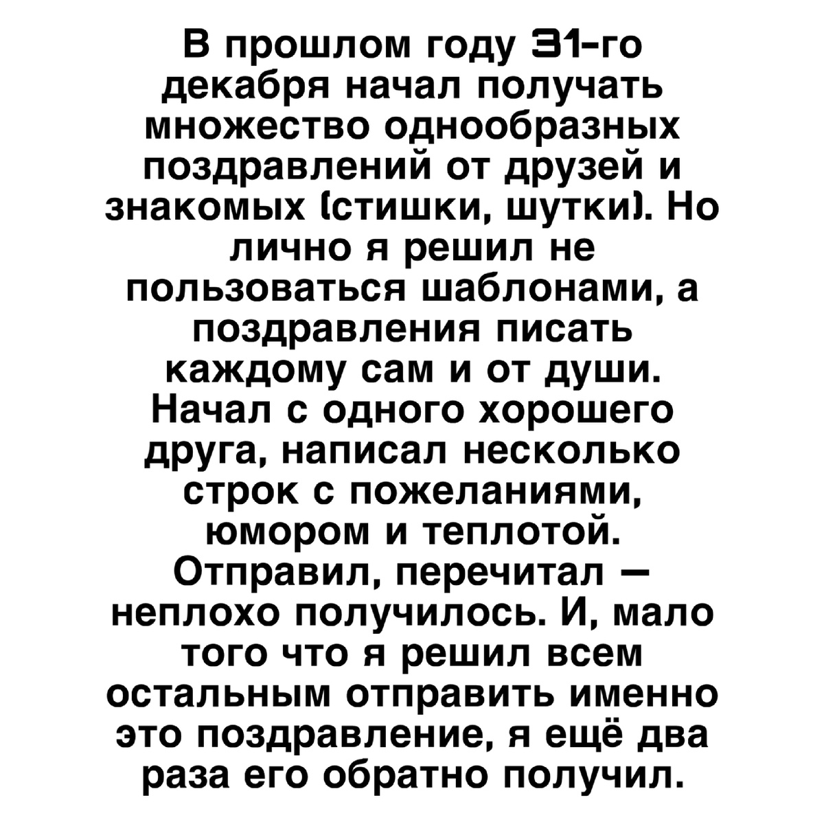 В прошлом году 31-го декабря начал получать множество однообразных поздравлений от друзей и знакомых (стишки, шутки). Но лично я решил не пользоваться шаблонами, а поздравления писать каждому сам и от души. Начал с одного хорошего друга, написал несколько строк с пожеланиями, юмором и теплотой. Отправил, перечитал — неплохо получилось. И, мало того что я решил всем остальным отправить именно это поздравление, я ещё два раза его обратно получил.