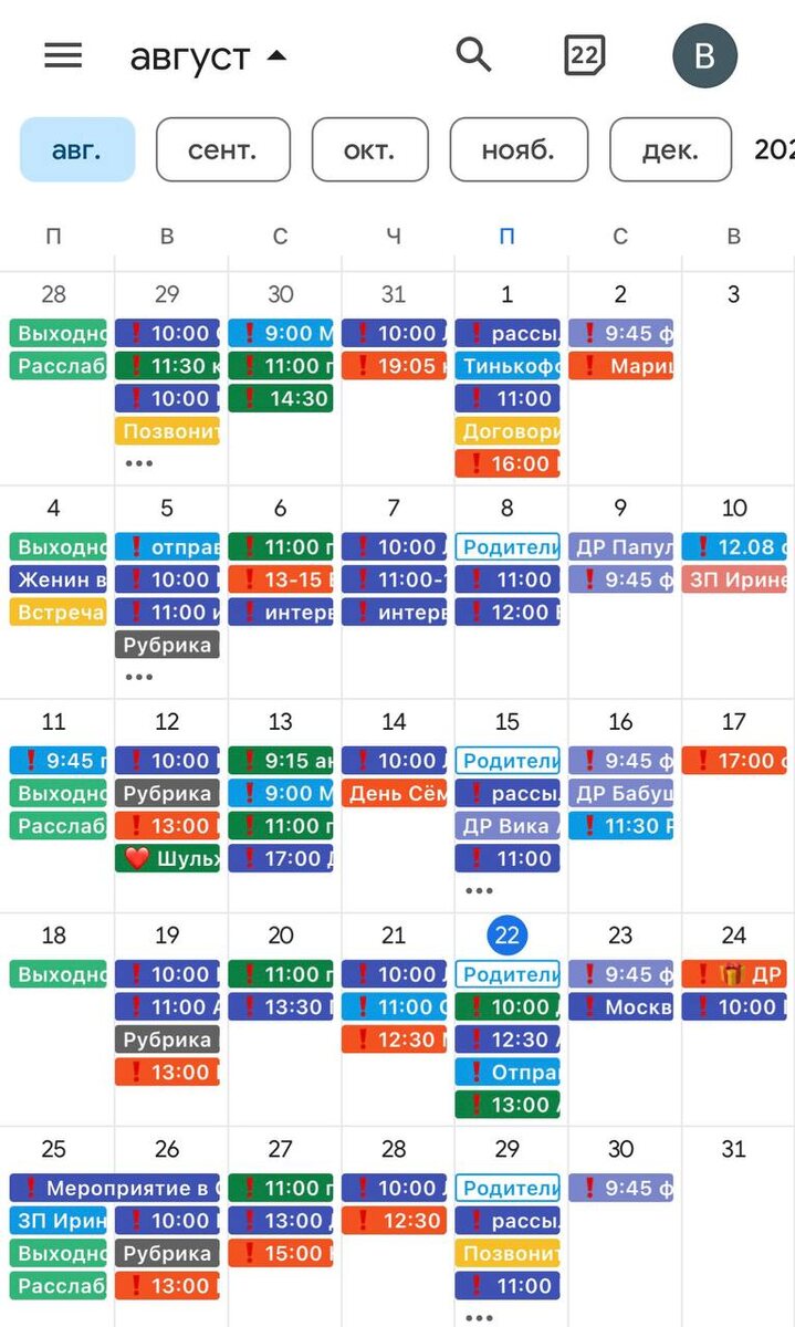 Раньше это и правда звучало бы забавно, в чем проблема? Захотели встретиться - давай «завтра». А не через 3 недели🤪 А потом наступает момент когда нужно наводить порядок в жизни. Мне в этом деле помогает календарь. Использую гугл календарь. Не реклама, рассказываю свой работающий на практике инструмент. Удобно потому что: можно использовать и на телефоне и на компьютере, он всегда под рукой, можно настроить цвета и повторяющиеся события. ➡️ У меня в календаре есть несколько повторяющихся событий, которые запланированы уже на месяцы и годы вперед. Например: 🗓 раз в пол года (январь/июнь) сдать анализы, сходить к терапевту, геникологу, маммологу. 🗓 ДР самых близких 🗓 День Сёмы - когда он прогуливает сад и мы с ним вдвоем классно проводим время целый день (раз в месяц) 🗓 один день в неделю - без дел (т.е.ВЫХОДНОЙ) когда я не ставлю никакие встречи и задачи на этот день или что-то вроде «массаж/баня». Не всегда выходит оставить день полностью свободным, но стараюсь сохра