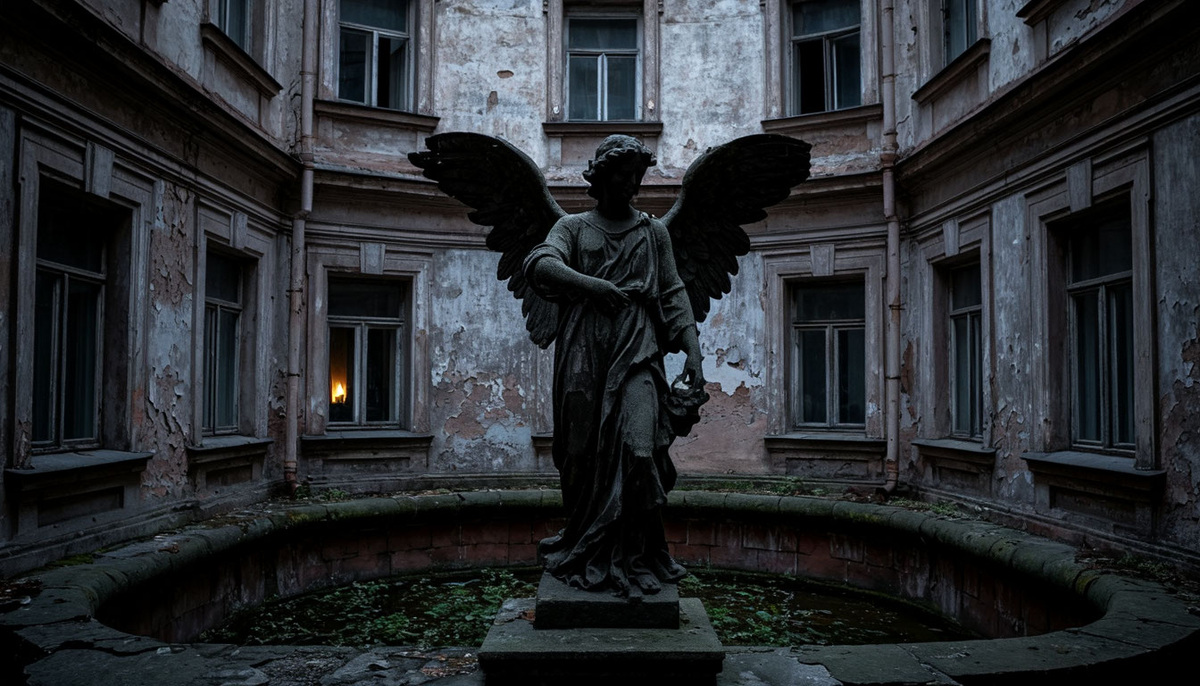 Это не тот помпезный ангел с дворцовой площади. Наш — скромный, забытый. Потемневший от времени и дождей, с отбитым крылом и лицом, которое непогода превратила в безмятежную, гладкую маску. Он стоит на потрескавшемся постаменте, и кажется, что он здесь был всегда, еще до того, как построили сам дом. Я всегда им любовался. Он был символом тихой, вечной красоты этого города.