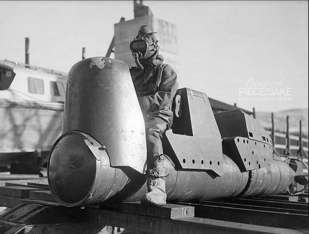 Эта фотография сделана 3 марта 1944 года в Ротсее, Шотландия. На ней мы видим командира корабля под названием «Чариот». По своей сути это была британская пилотируемая торпеда, использовавшаяся во время Второй Мировой войны. Само подводное судно действительно напоминало торпеду, только очень большую — его длина составляла семь метров. Экипаж состоял из двух дайверов, но, как можно заметить, они не были снабжены стандартными баллонами для подводного плавания. Вместо этого на лица надевалась специальная маска, а воздух находился внутри самого корабля-торпеды. Нет, англичане не использовали камикадзе — людей берегли. Судно приводилось в движение электродвигателем, что делало его практически бесшумным и незаметным для акустиков врага. Как действовали водолазы? Они вручную, находясь на небольшой глубине, направляли торпеду к вражескому кораблю, «пришвартовывались» к его борту и прикрепляли магнитные мины. Взорвать бомбу дистанционно было нельзя, поэтому устанавливался таймер, после чего дай