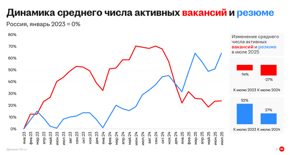 Все больше сообщений я получаю: «Слушай, ну невозможно найти работу этим летом. Отправляю десятки резюме — тишина». И пишут мне не только мои знакомые, но и знакомые их знакомых, да и сами кандидаты в личку. Знаете что? Это не просто эмоции. Это реальность. 📉 Сейчас мы вошли в рецессию на рынке труда, и это видно невооружённым глазом. Я писал в предыдущих статьях про кризис в угольной отрасли, про сокращения на заводах, про скрытую безработицу — так вот, пазл складывается. Экономика тормозит, и рынок труда сразу реагирует. Чтобы было понятнее, давайте посмотрим на статистику по индексу hh за последние 5 лет. Помните, как в 2020-м найти работу было практически невозможно? Люди по полгода сидели без дела, хватались за любую подработку. Так вот: сейчас индекс — 6.0. Почти ковидный уровень. Здесь очень важный момент. Многие скажут: «Так ведь уровень безработицы низкий, значит всё нормально». Но правда другая. Люди ищут работу не потому, что остались на улице. Они ищут потому что не хвата